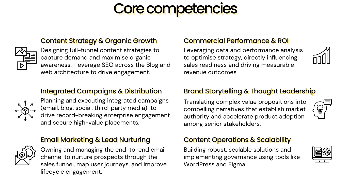 I specialise in turning complex products into compelling stories that get adopted by global organisations and fast-growing startups. I design and build full-funnel content strategies that directly meet company revenue goals, and I'm equally happy to roll up my sleeves and execute the strategy myself.